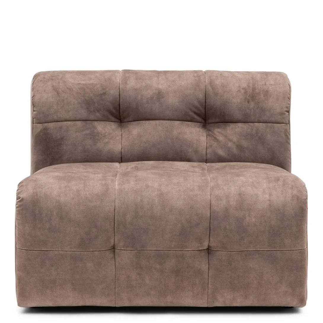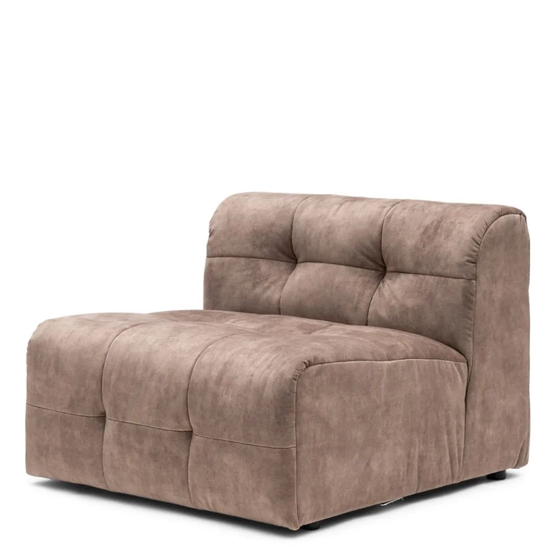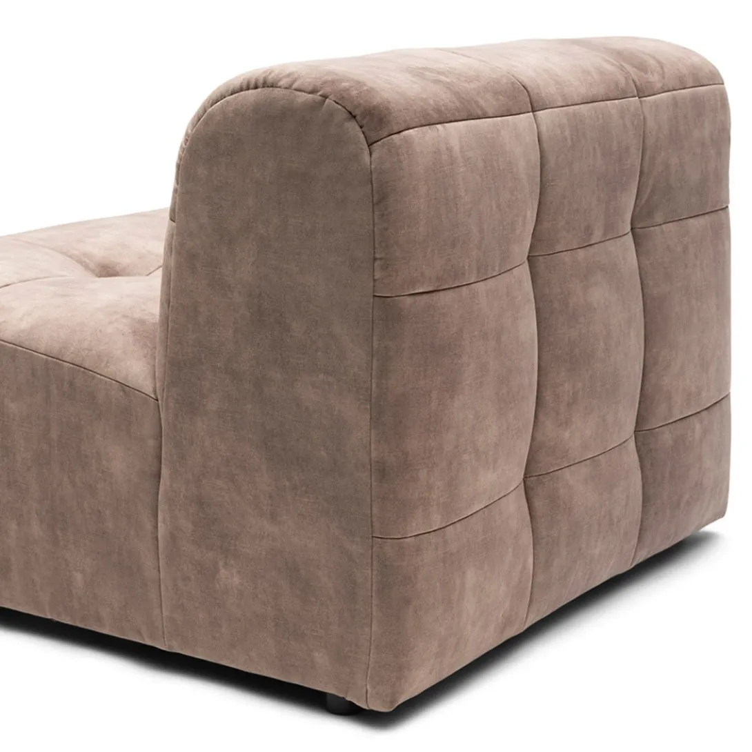 Dit is het middendeel van de zelf samen te stellen, modulaire bank The Jones. Een heerlijke, lage bank, met opvallende bekleding met capitonnering zonder knoop. Dit middendeel heeft alleen een rugleuning, dit maakt hem ook zeer geschikt om als los element, als een soort van loveseat, in de ruimte te plaatsen.