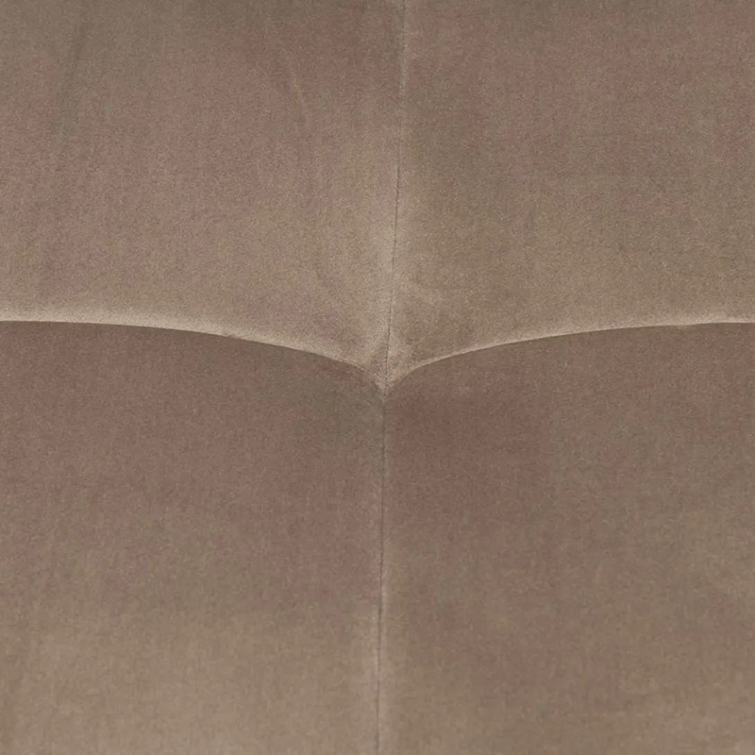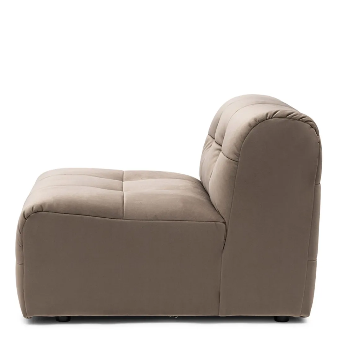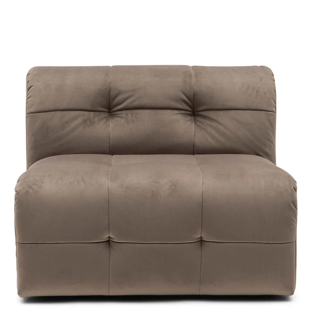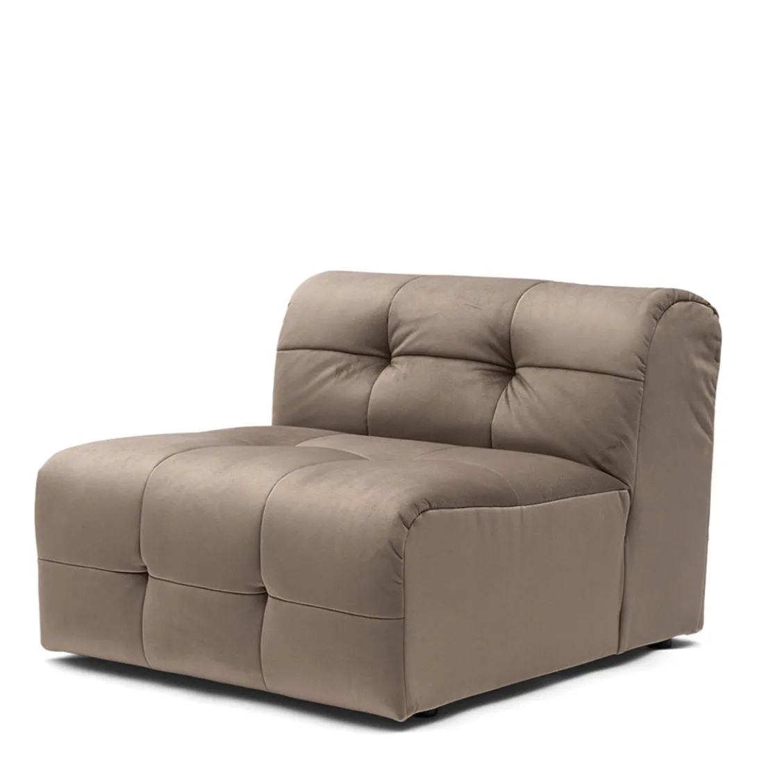 Dit is het middendeel van de zelf samen te stellen, modulaire bank The Jones. Een heerlijke, lage bank, met opvallende bekleding met capitonnering zonder knoop. Dit middendeel heeft alleen een rugleuning, dit maakt hem ook zeer geschikt om als los element, als een soort van loveseat, in de ruimte te plaatsen.