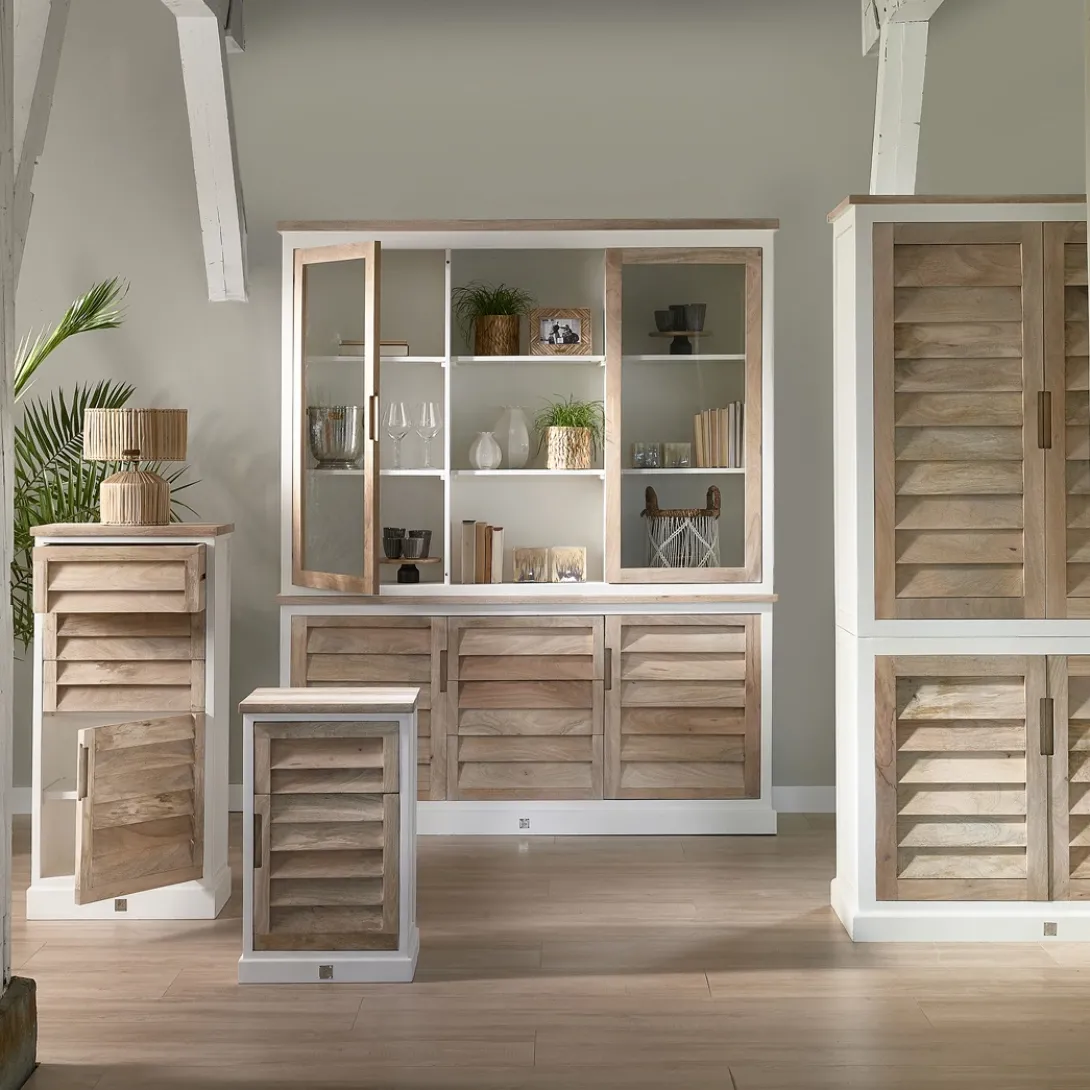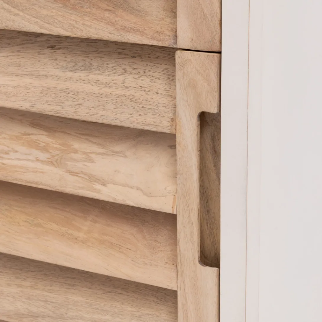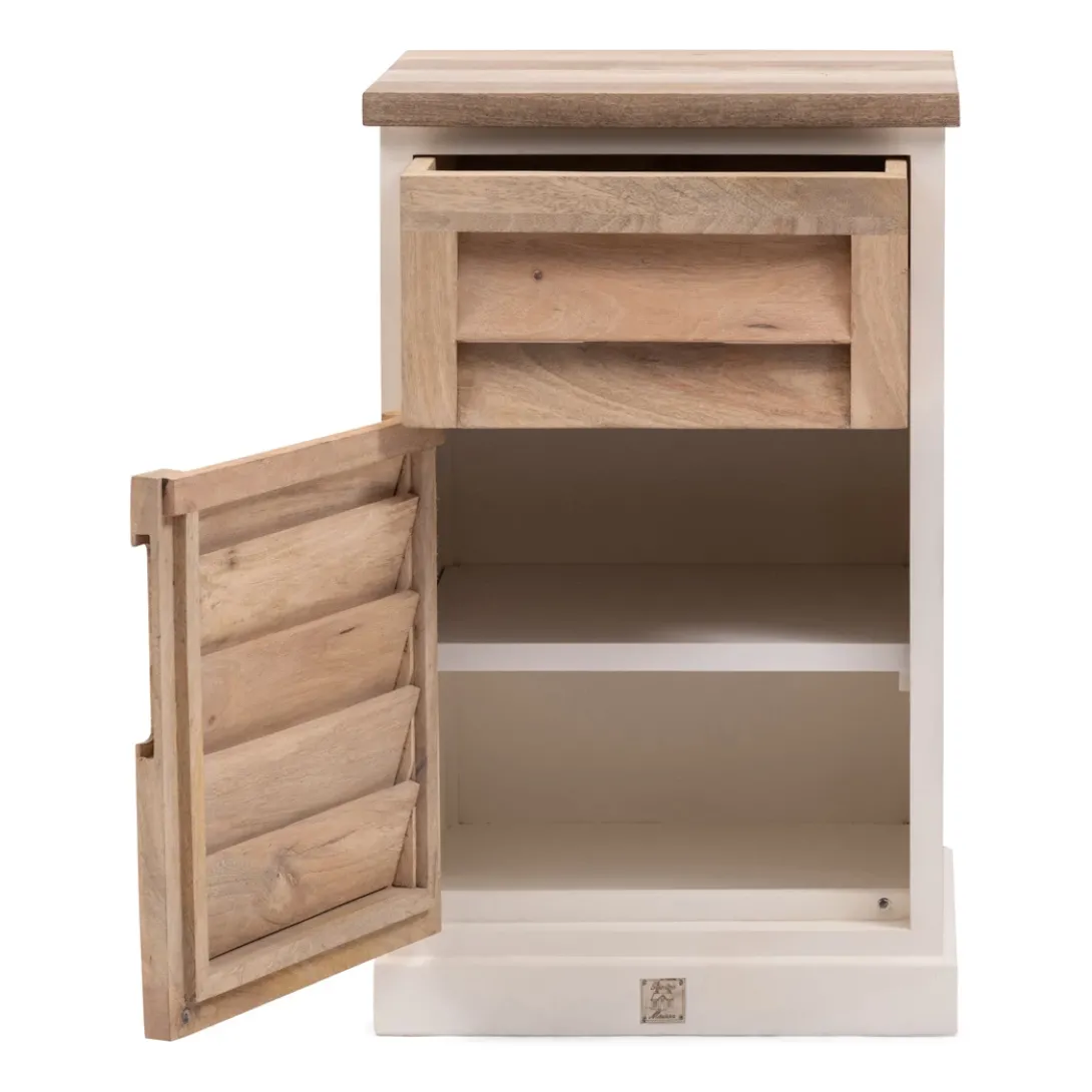 De Pacifica-serie heeft nu ook meubelen voor in de slaapkamer, zoals dit nachtkastje. Het kastje is gemaakt van mangohout in een naturel kleur met een witte coating. De voorkant heeft een shutter-look, hierin zit een deurtje en een onzichtbare lade verborgen. Verkrijgbaar in een linker- en een rechtervariant.