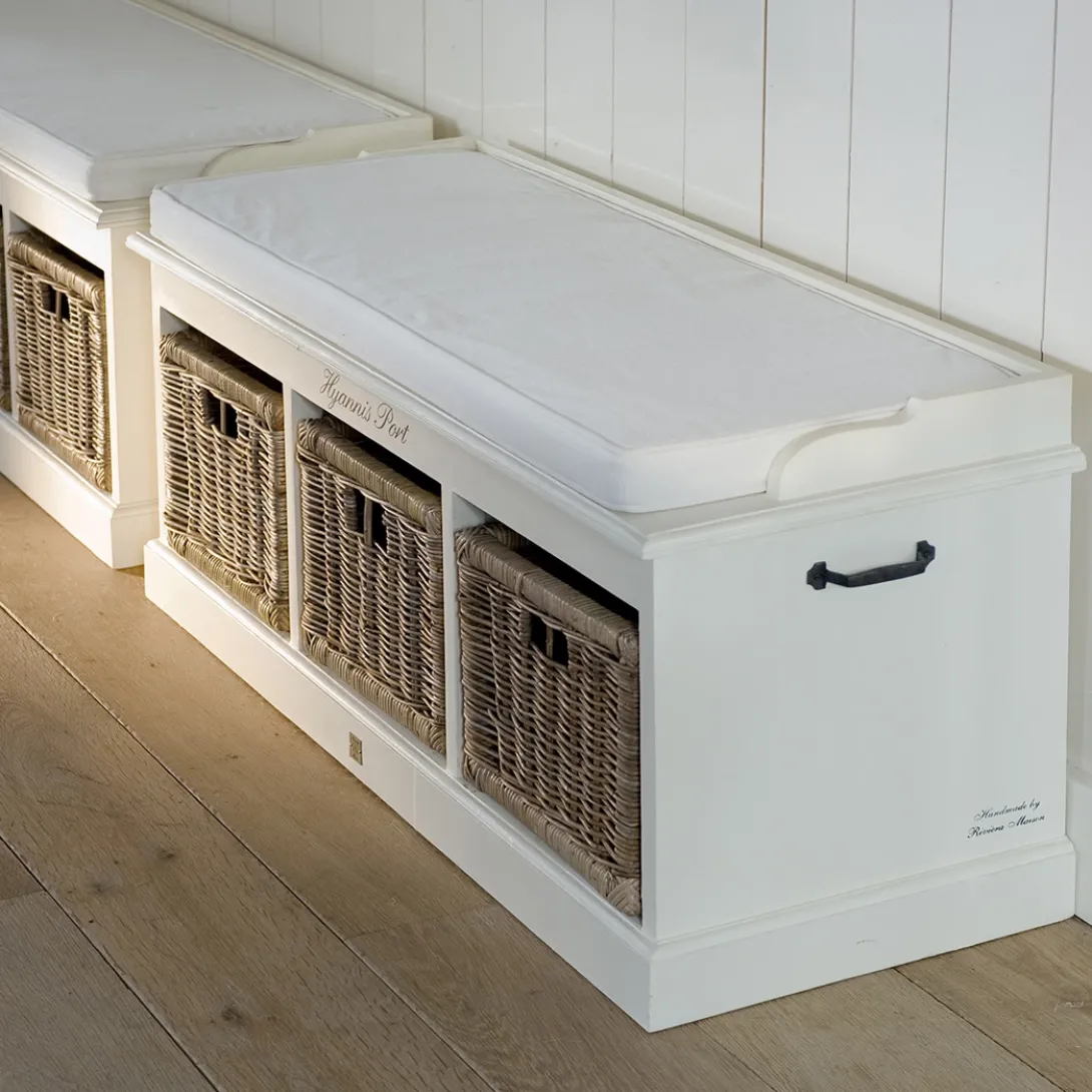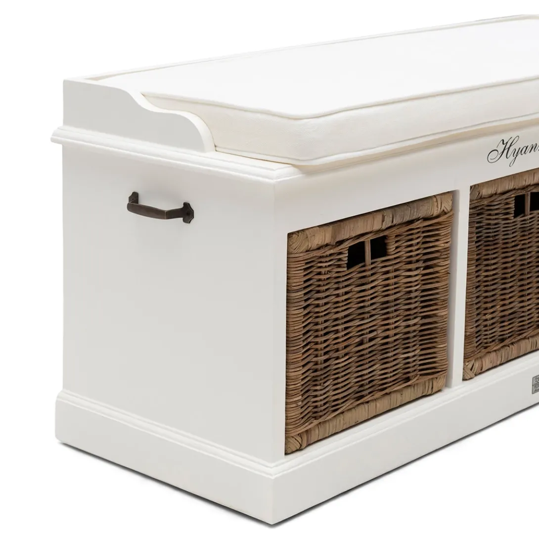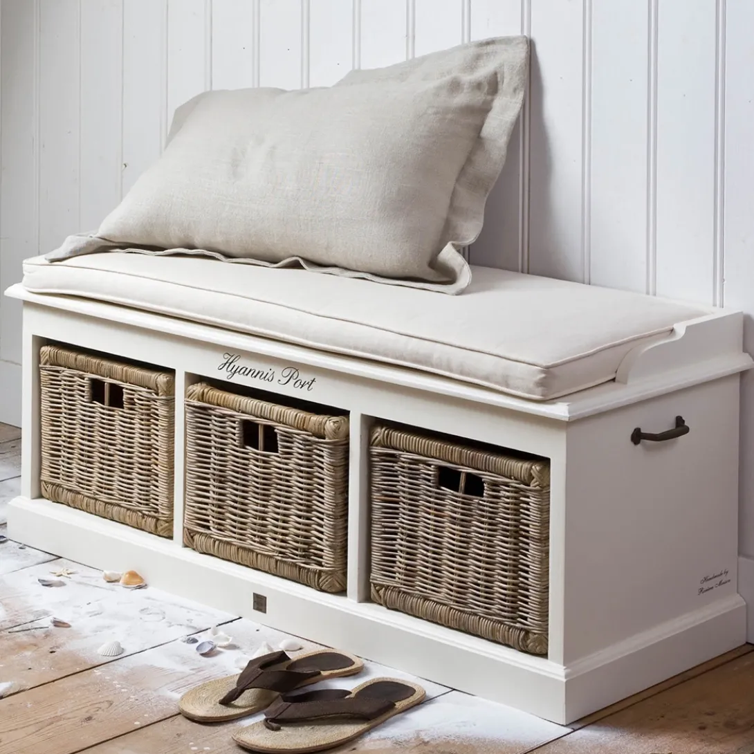 Een leuk bankje voor in de hal met manden voor schoenen of shawls. In de slaapkamer voor aan het voeteneind of in de kinderkamer voor speelgoed in op te bergen.