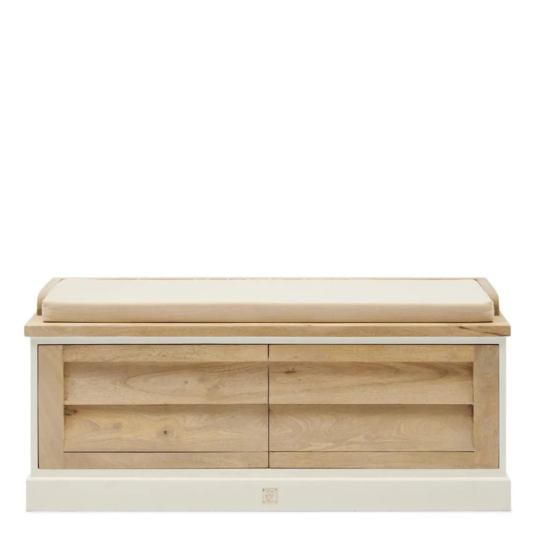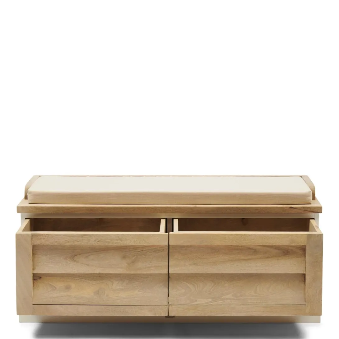 Een multifunctioneel bankje handgemaakt van duurzaam mangohout. De mangoboom wordt pas gekapt als hij helemaal geen vruchten meer produceert. Zo krijgt de boom een tweede leven in onder meer de meubelbranche. De bekleding van dit bankje is van katoen. Het bankje heeft opbergruimte.
