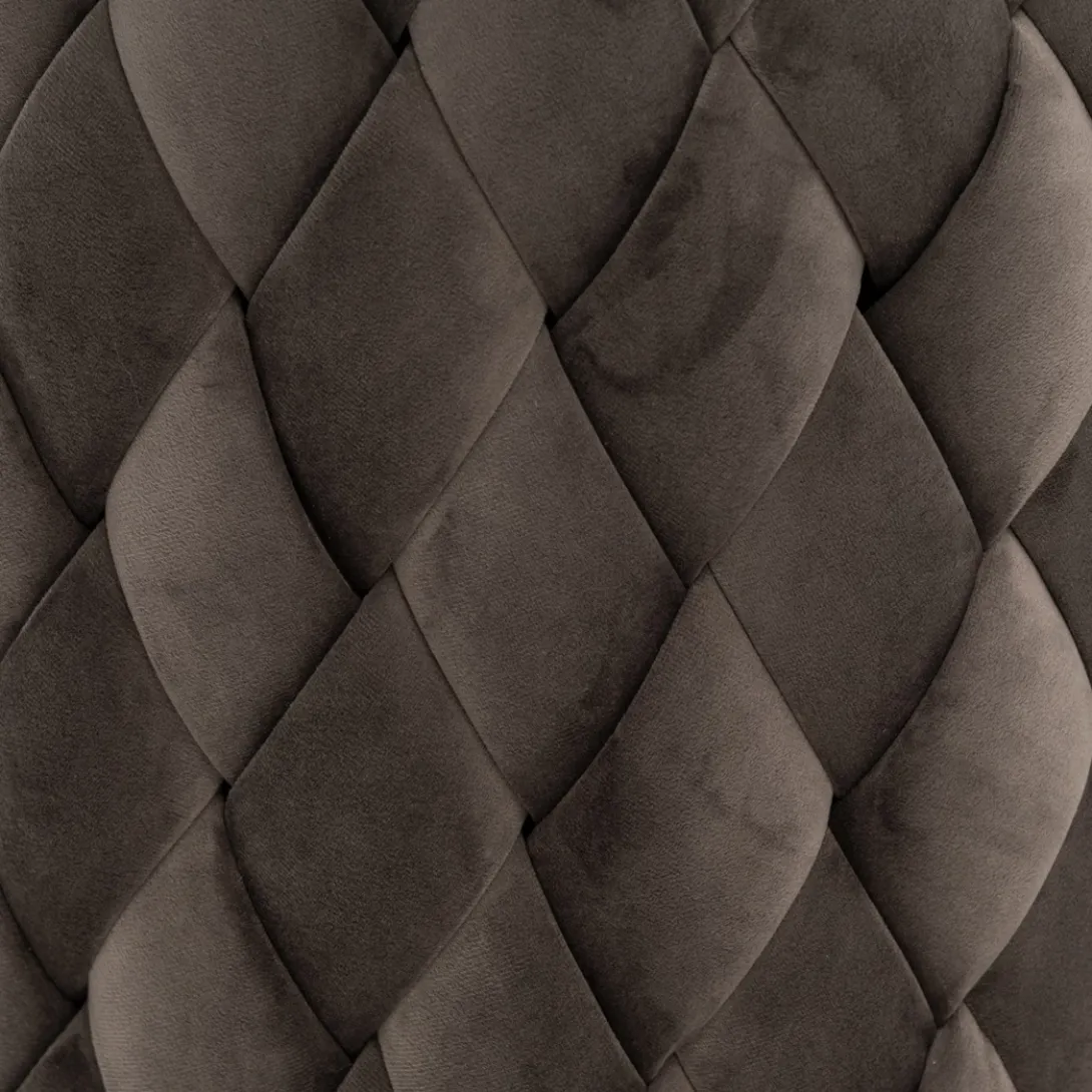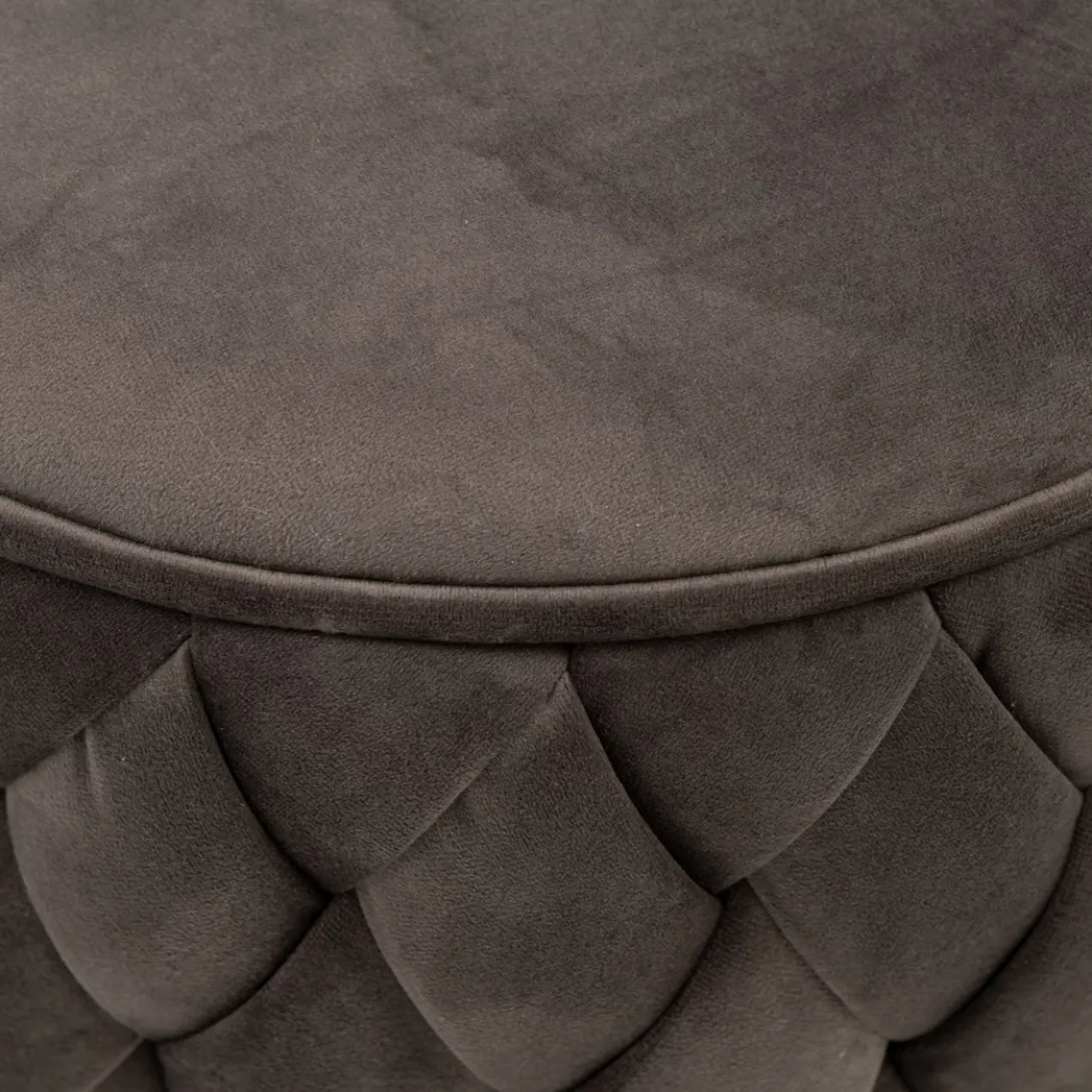 Hier kun je zien hoe goed eenvoud kan werken. De bekleding van deze ronde poef bestaat uit met de hand gevlochten repen stof. Het resultaat is prachtig. Dat komt mede door de stof die is gebruikt, Velvet III, in de kleur Anthracite.