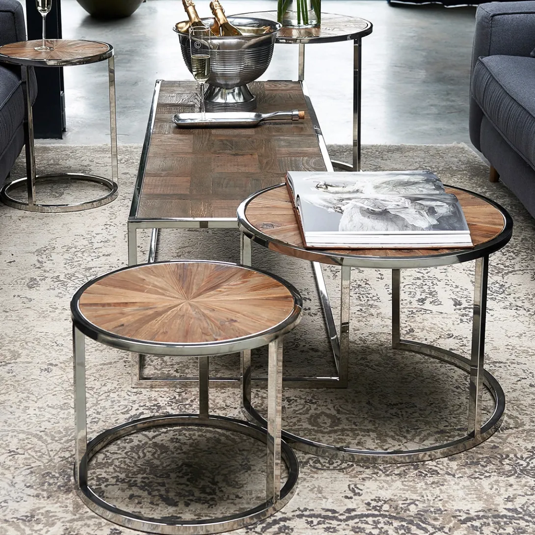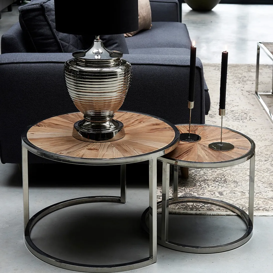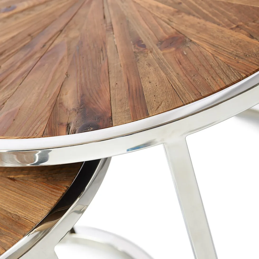 Deze prachtige koffietafel bestaat uit twee losse tafels die onder elkaar te schuiven zijn. Handig met visite als u extra ruimte nodig heeft om thee en lekkers op neer te zetten. Het tafelblad bestaat uit vele stroken gerecycled sparrenhout dat de tafels een stoere look geven. De diameter van de hoogste tafel is 60 cm, van de kleinere tafel is de diameter 45 cm. De combinatie met het chique RVS onderstel maakt dat de tafel in meerdere interieurstijlen erg goed past.