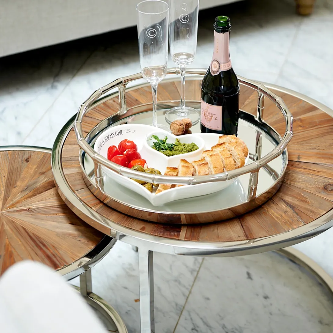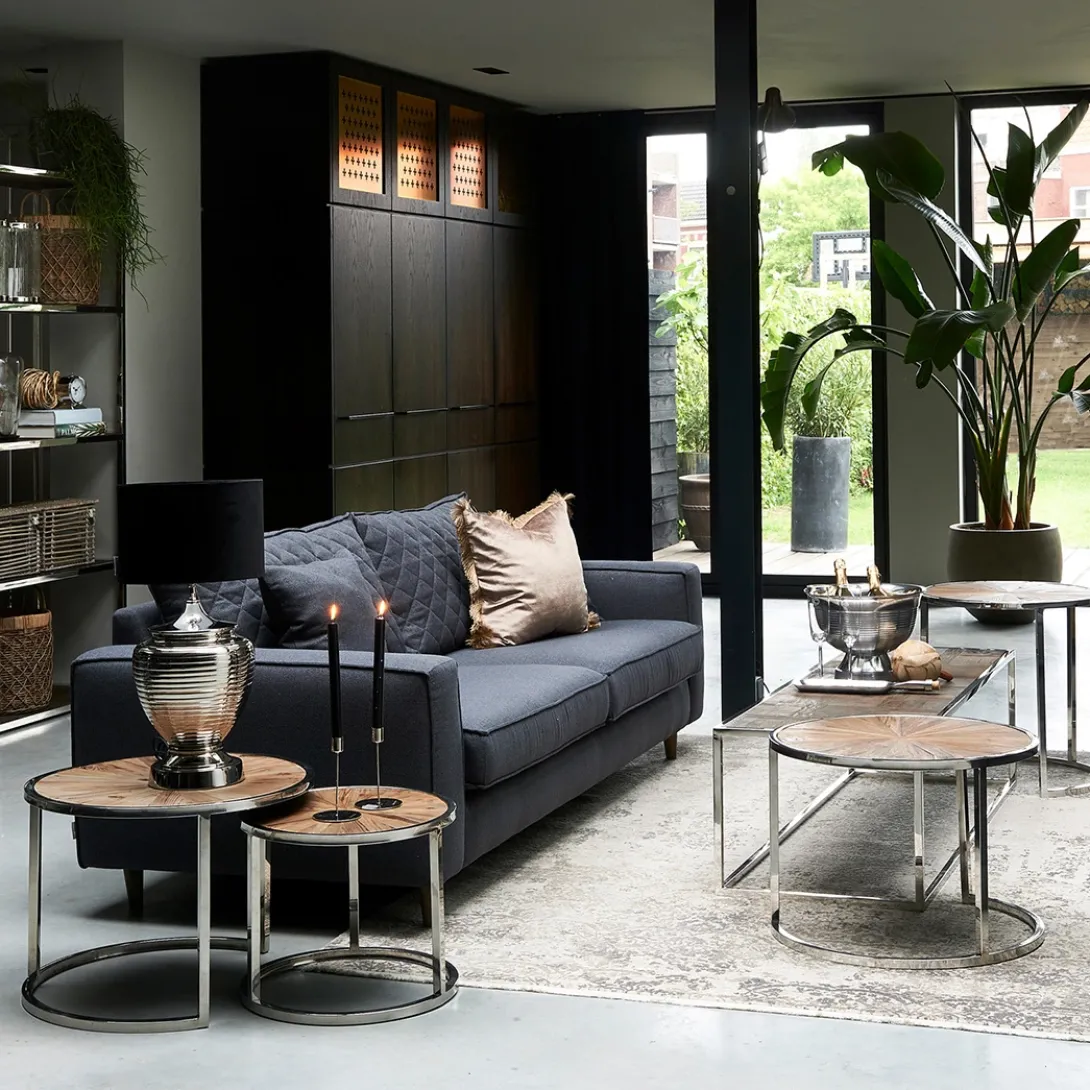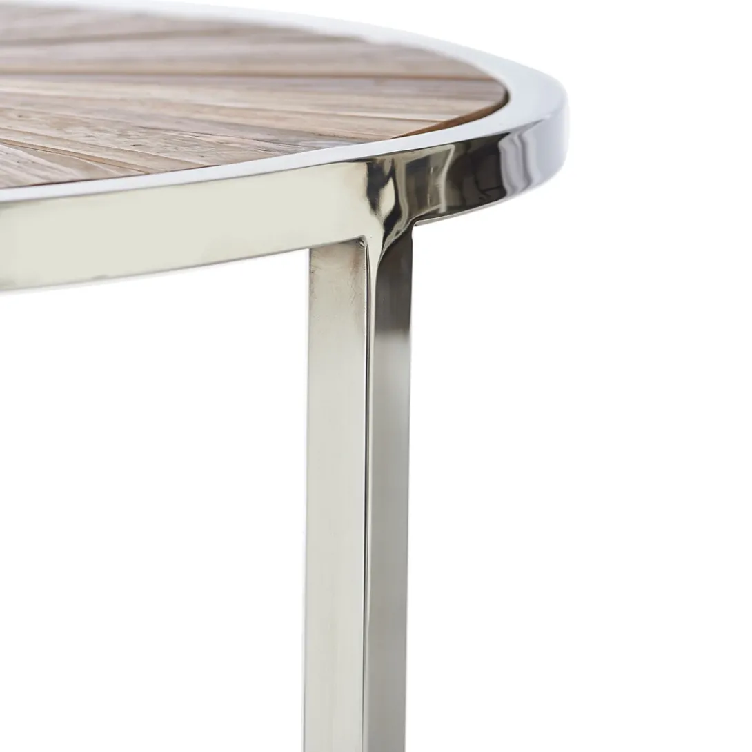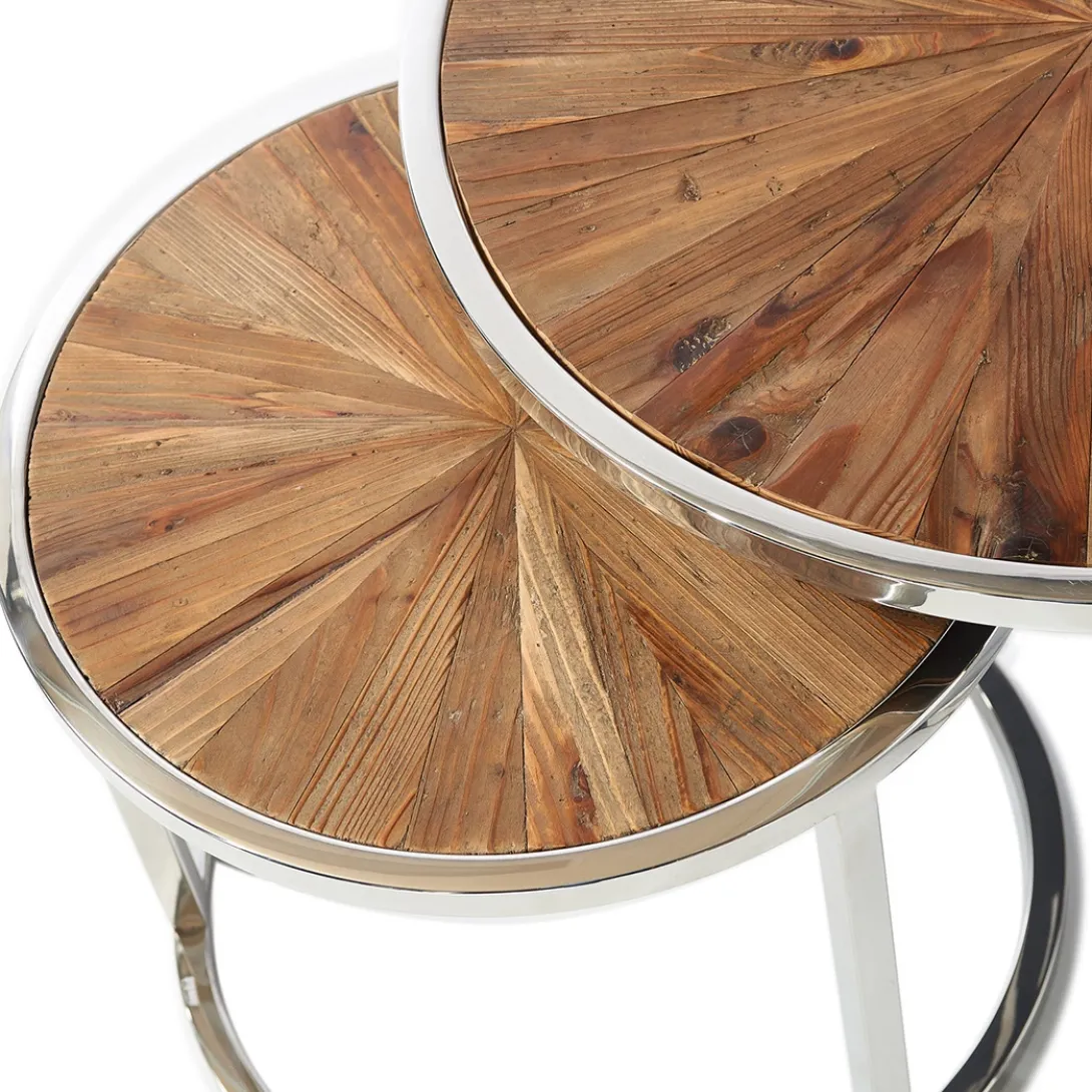 Deze prachtige koffietafel bestaat uit twee losse tafels die onder elkaar te schuiven zijn. Handig met visite als u extra ruimte nodig heeft om thee en lekkers op neer te zetten. Het tafelblad bestaat uit vele stroken gerecycled sparrenhout dat de tafels een stoere look geven. De diameter van de hoogste tafel is 60 cm, van de kleinere tafel is de diameter 45 cm. De combinatie met het chique RVS onderstel maakt dat de tafel in meerdere interieurstijlen erg goed past.