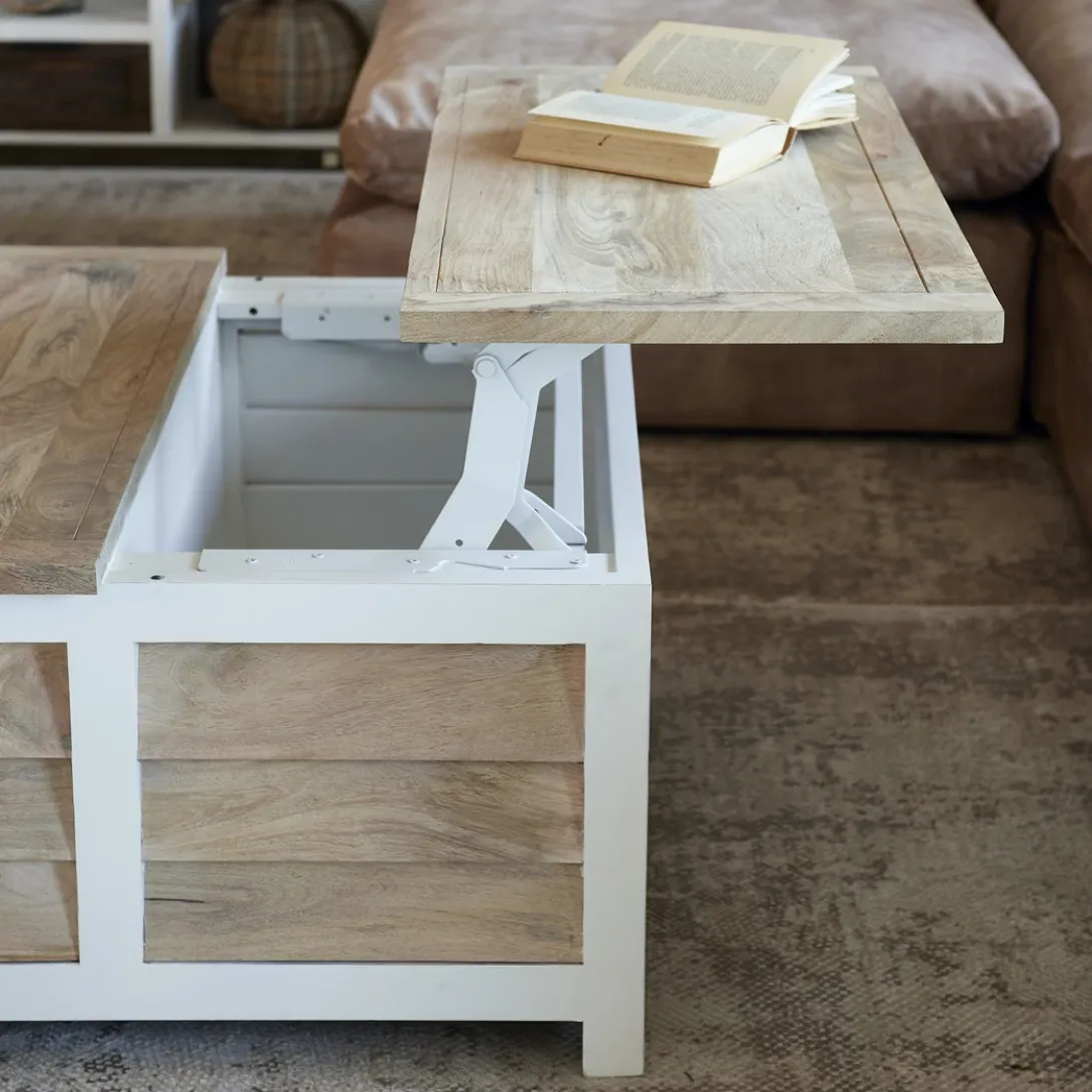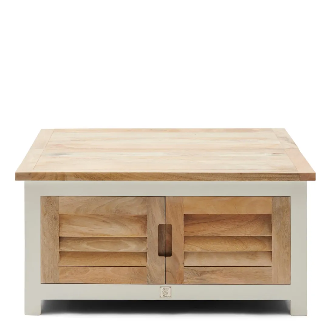 De Pacifica-lijn is herkenbaar aan het design met shutters en het gebruik van mangohout. Door het natuurlijke mangohout in diverse tinten heeft iedere salontafel een eigen look. Wil je met een hapje en drankje of met je laptop op de bank zitten, dan kan een deel van het blad van deze vierkante Pacifica Coffee Table omhoog.