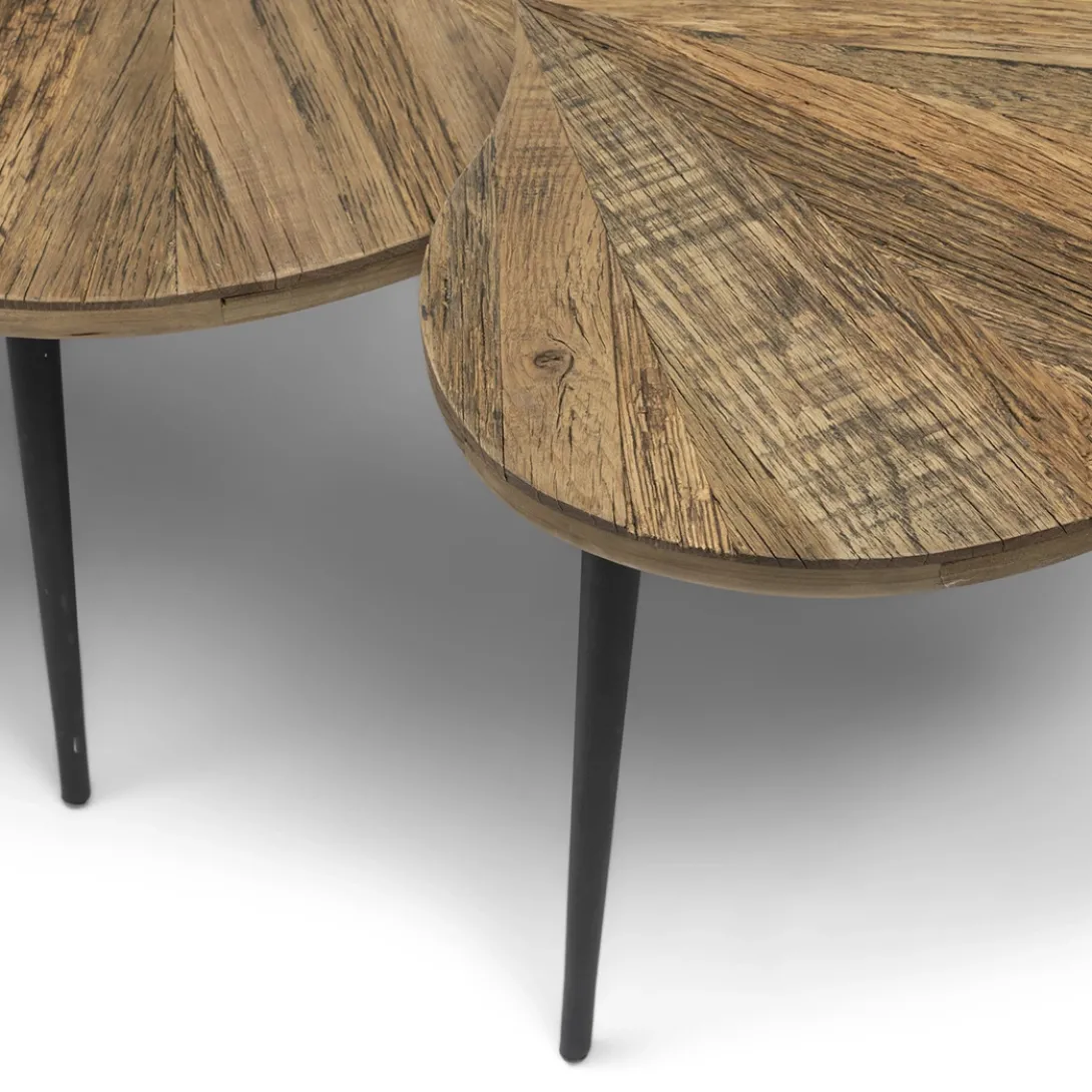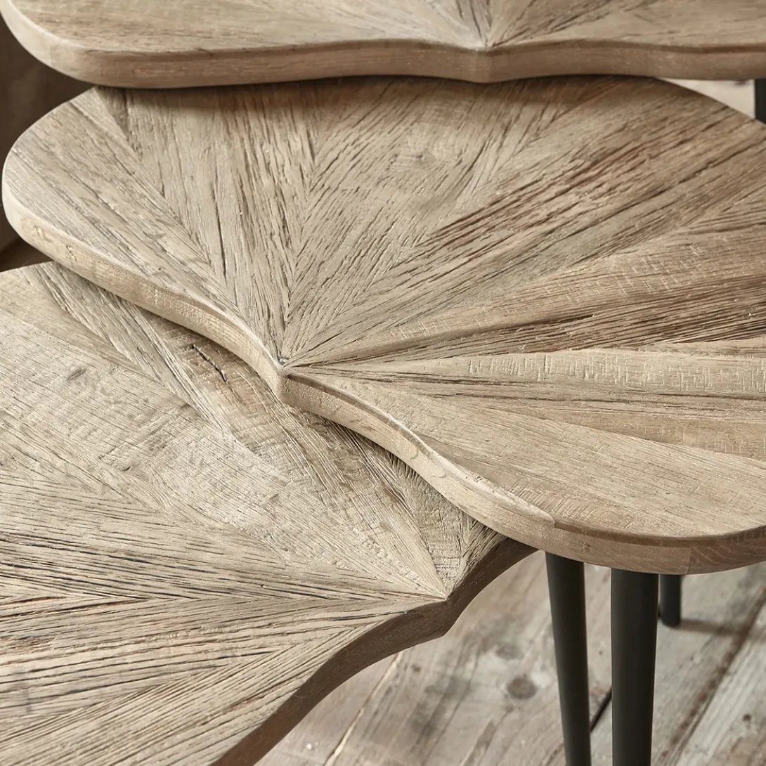Breng een tropische sfeer in huis met salontafel Palm Springs, een prachtige set van 3. Gemaakt van reclaimed iepenhout en ijzer. De tafelbladen in de vorm van een palmblad voegt een speelse en organische touch toe aan je interieur. Met afmetingen van 58x40x40 cm, 58x40x37 cm en 58x40x33 cm is er genoeg ruimte voor al je favoriete decoraties.