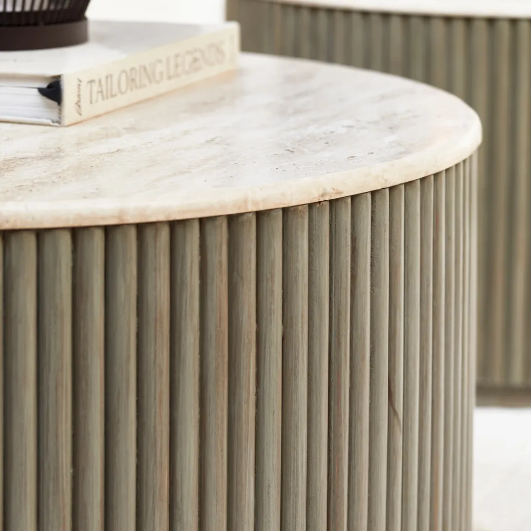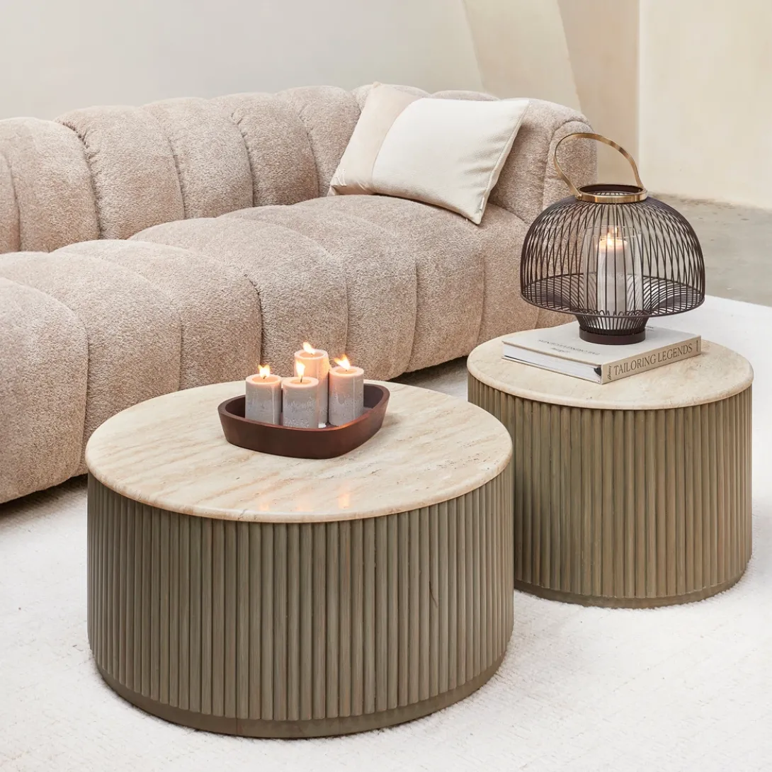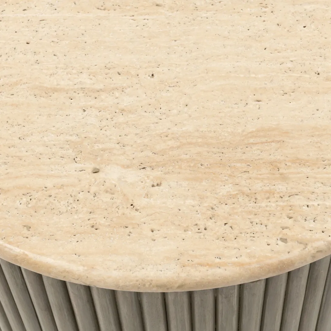 - Deze ronde salontafel voegt stijl en elegantie toe aan je woonkamer. Het travertijnen blad biedt een chique en tijdloze uitstraling, waardoor elke tafel uniek is. De brede voet, ingelegd met mangohouten stroken, zorgt voor een moderne look en voegt zowel stabiliteit als karakter toe aan het ontwerp. Deze salontafel is perfect om een luxe accent toe te voegen aan je interieur en vormt een prachtig middelpunt in jouw woonkamer.