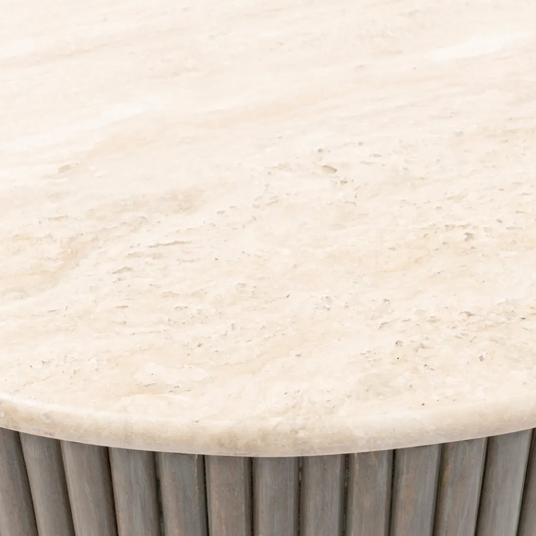 - Deze ronde salontafel is een stijlvolle toevoeging aan je woonkamer. Het travertijnen blad straalt een chique en tijdloze elegantie uit, waardoor het een eyecatcher is in elk interieur. De brede voet, ingelegd met mangohouten stroken, zorgt voor een moderne look en voegt zowel stabiliteit als karakter toe aan het ontwerp. Deze salontafel is perfect om een luxe accent toe te voegen aan je interieur en vormt een prachtig middelpunt in jouw woonkamer.