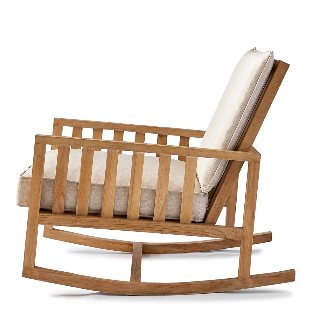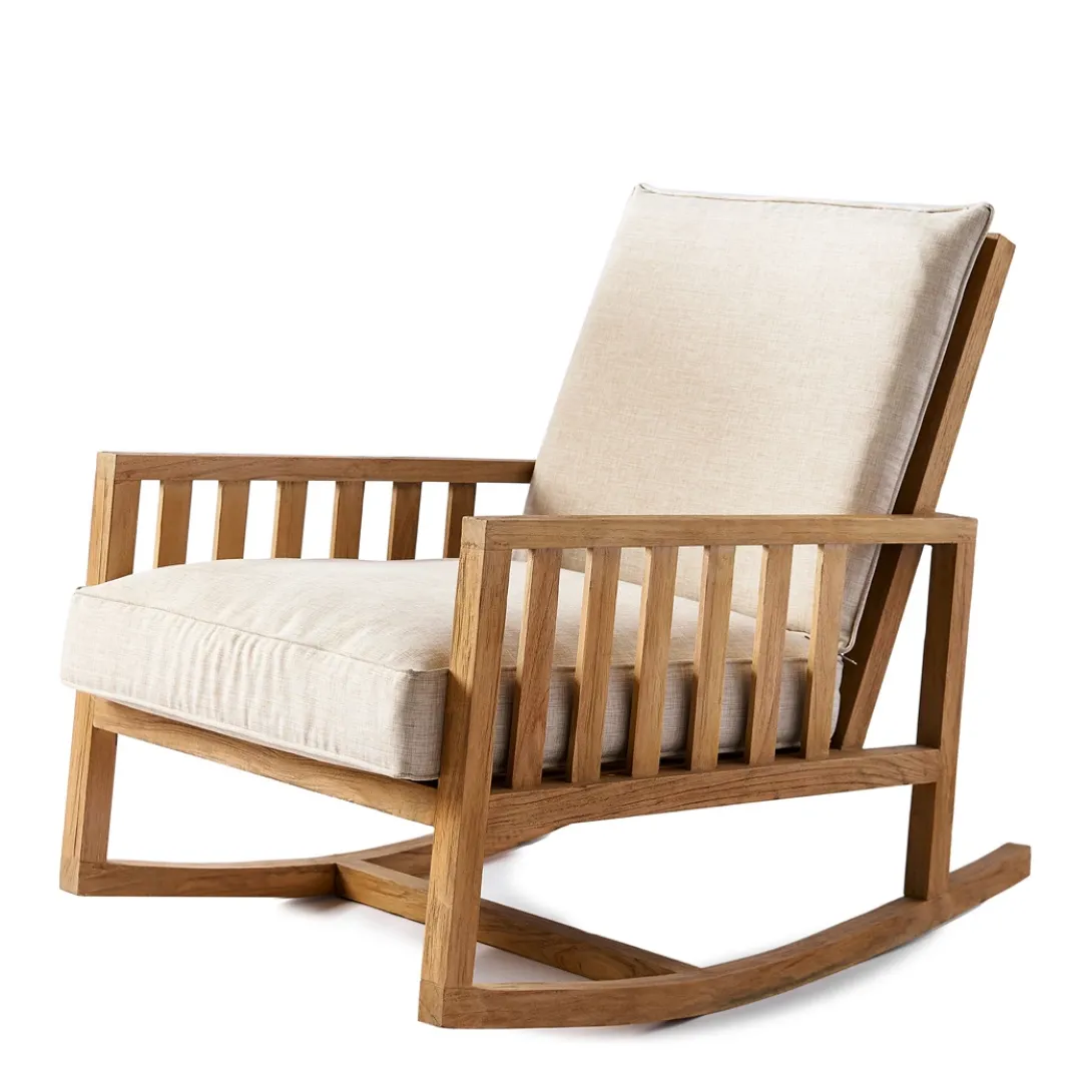 Lekker licht schommelend de zomeravond langs laten glijden. Haal er in gedachten de mondharmonica bij en een fles van het een of ander uit de ruige tijd van de Verenigde Staten, en de sfeer is compleet. Dankzij dit uniek gemaakte meubelstuk, waar zoveel vakmanschap en liefde in zit, dat een mens zich er wel goed in moet voelen. Het hout is teak, en de zitting en rug zijn van katoen.