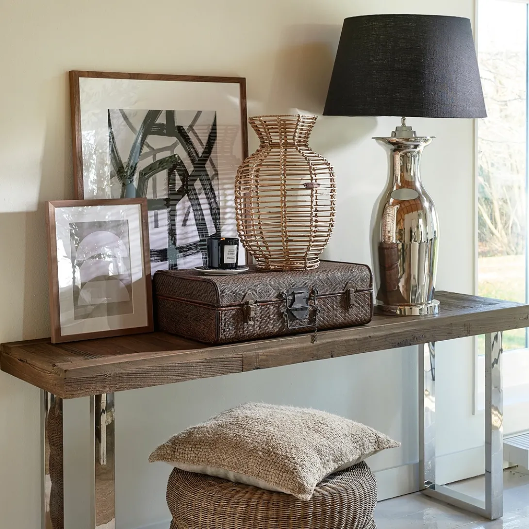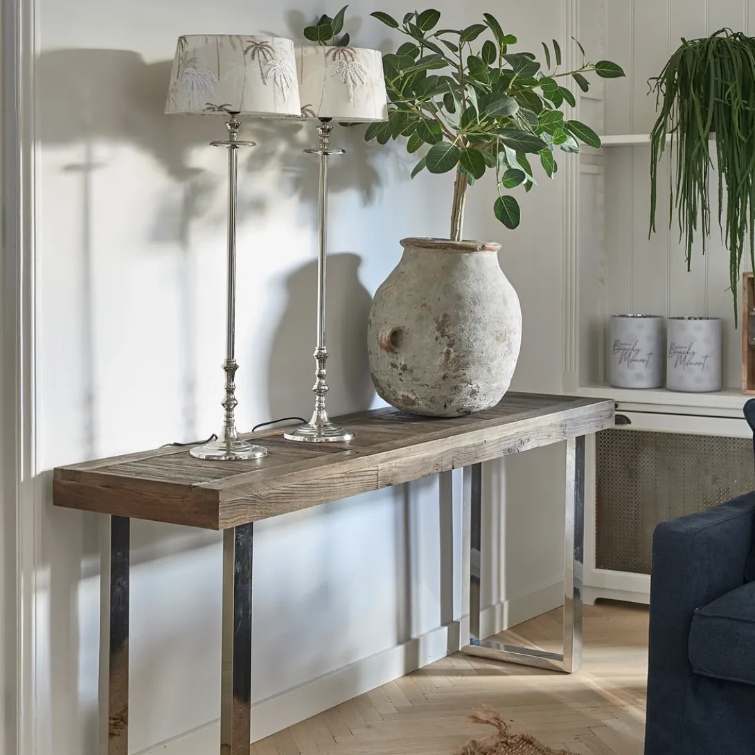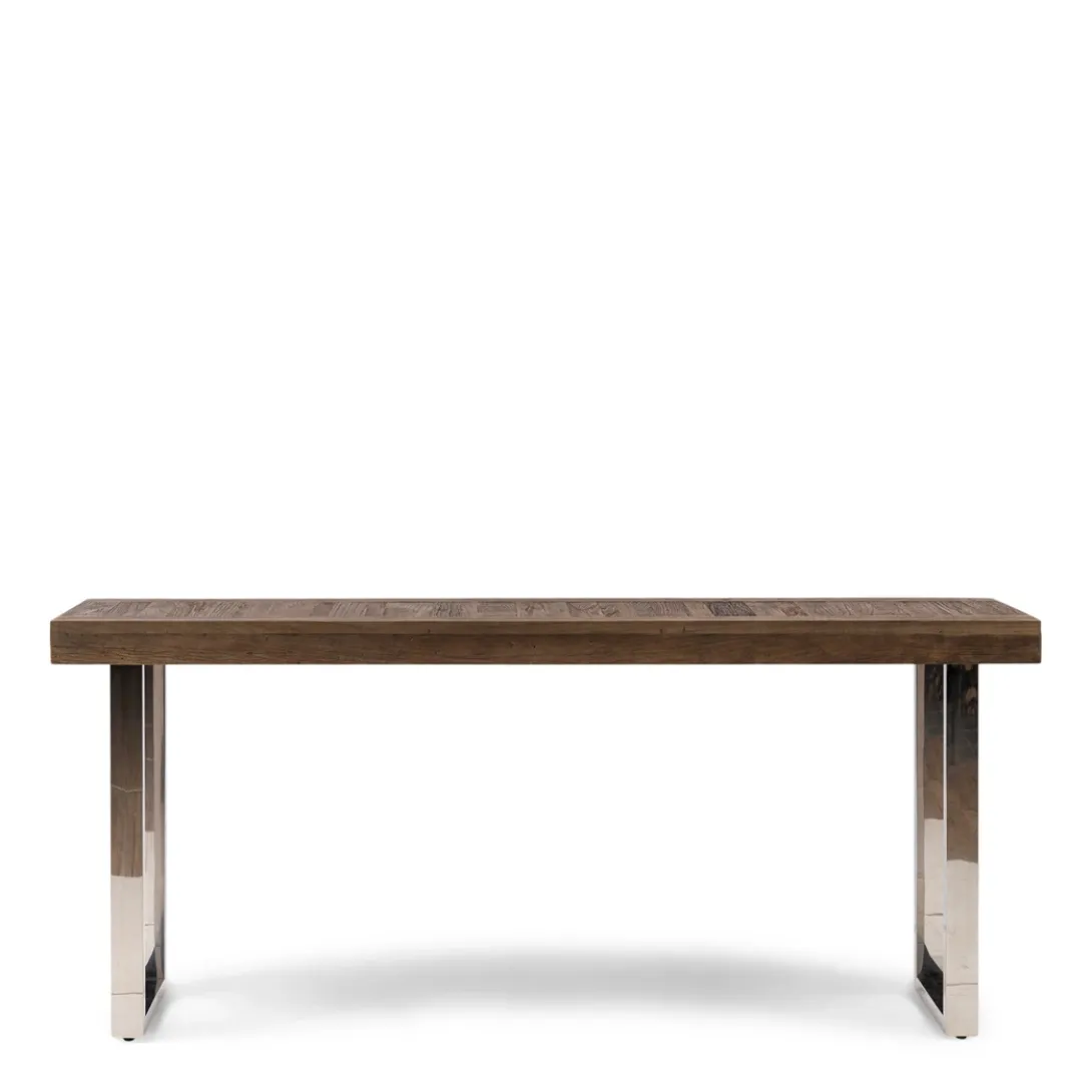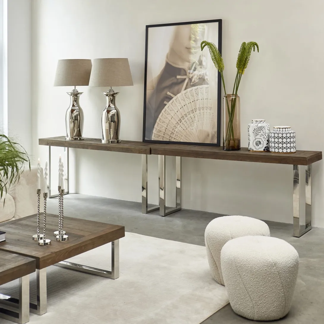 Een eigentijdse sidetable van gerecycled iepenhout, wat mooi verwerkt is in het bovenblad. Het chromen onderstel heeft zacht glanzende sledepoten. Een sidetable kan overal in huis staan, en heeft dan op elke plek een eigen functie.