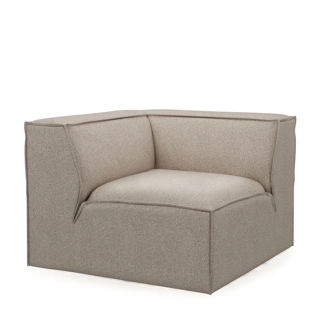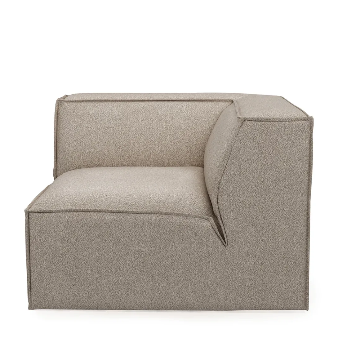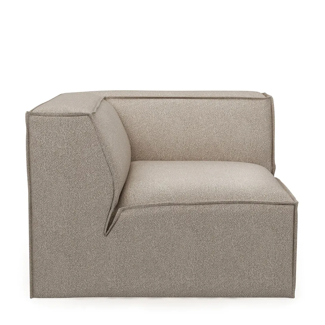 Een stoere bank in losse elementen, zodat naar believen een zitmeubel kan worden samengesteld. Dit hoekelement is 105 cm breed, er is ook een iets breder formaat verkrijgbaar. De bankelementen bestaan uit één stuk en zijn gemaakt van beukenhout. Daardoor zijn ze desgewenst goed te verschuiven. De bouclé bekleding is lekker zacht.