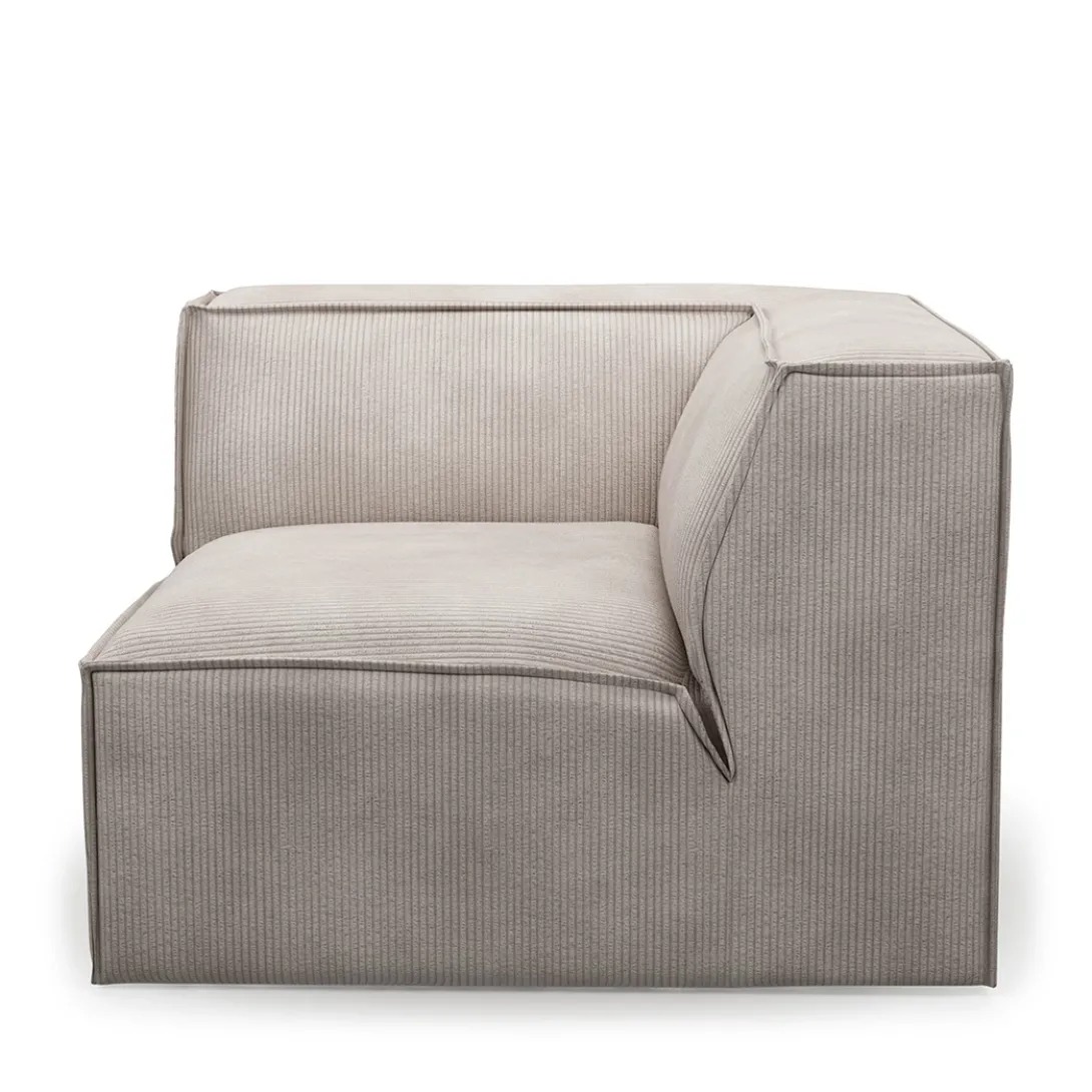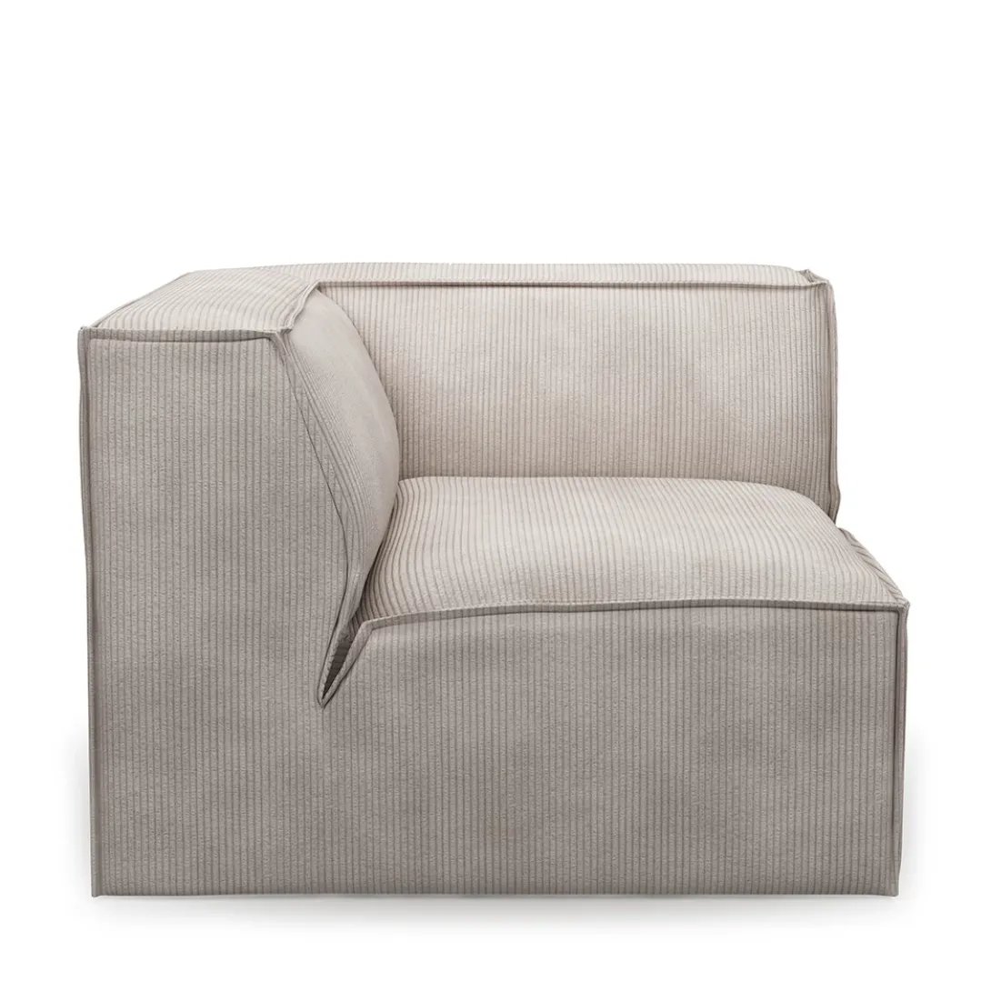 Een stoere bank in losse elementen, zodat naar believen een zitmeubel kan worden samengesteld. Dit hoekelement is 105 cm breed, er is ook een iets breder formaat verkrijgbaar. De bankelementen bestaan uit één stuk en zijn gemaakt van beukenhout. Daardoor zijn ze desgewenst goed te verschuiven. De ribfluwelen bekleding is lekker zacht.