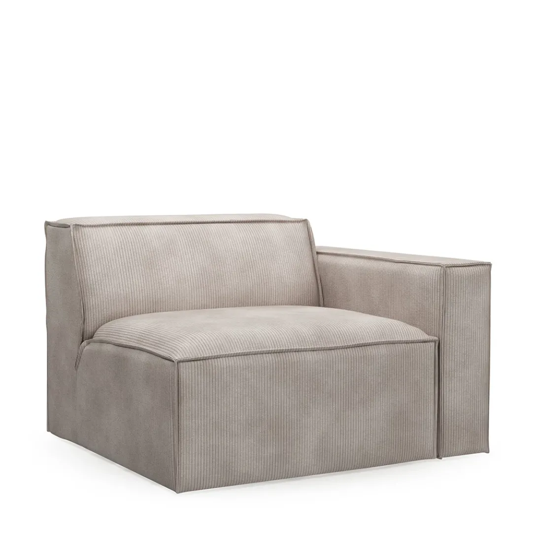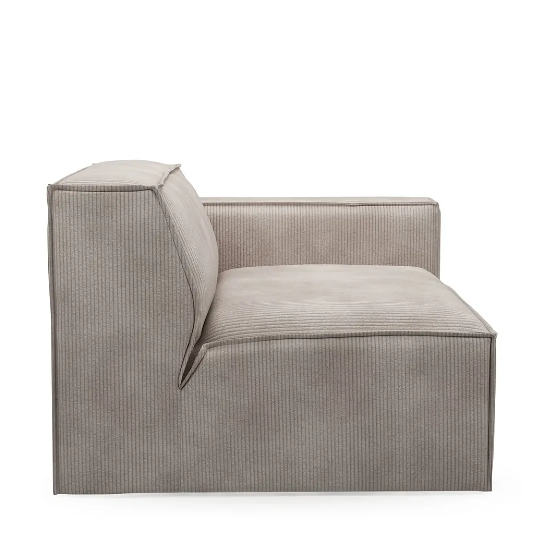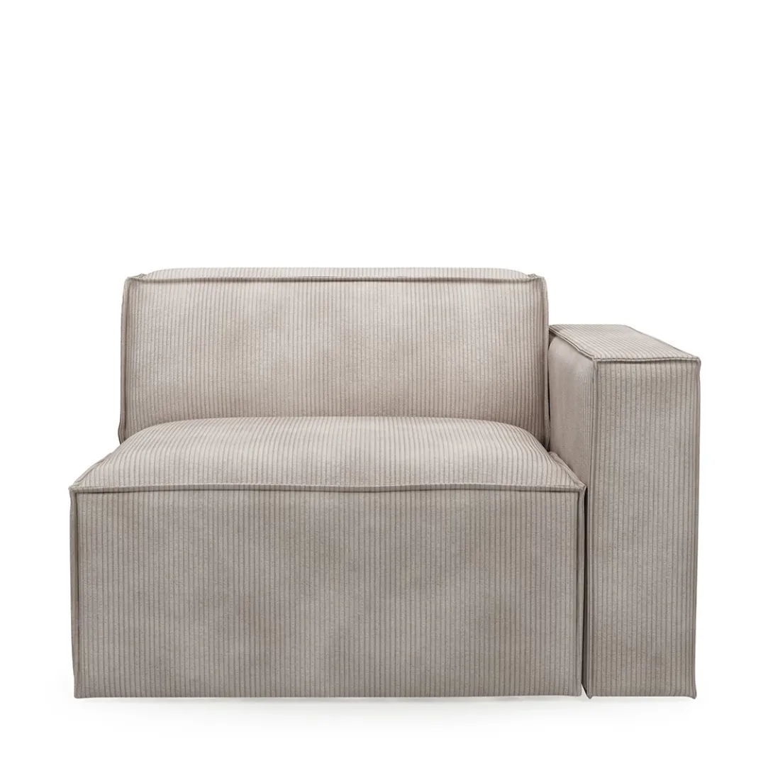 Deze moderne bank van ribfluweel in een prachtige beige kleur is een echte eyecatcher. De bank bestaat uit verschillende componenten die je zo samen kunt stellen om de bank perfect in jouw interieur te laten passen. Zo heb je altijd een bank die helemaal naar jouw smaak is. De losse delen zijn makkelijk aan elkaar te bevestigen en er zitten beukenhouten poten onder de bank. Deze rechterhoek is voorzien van een mooie, hoge leuning met een strakke afwerking.