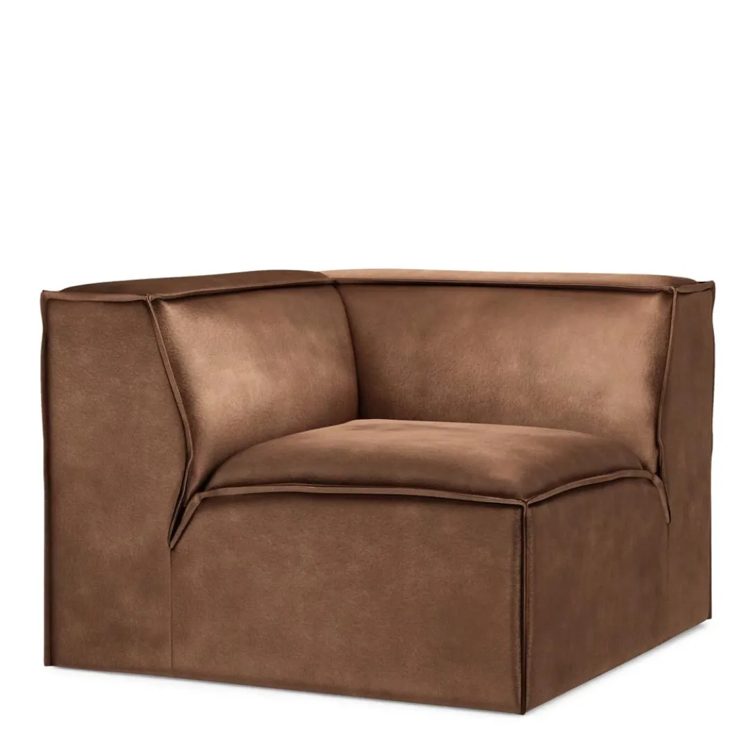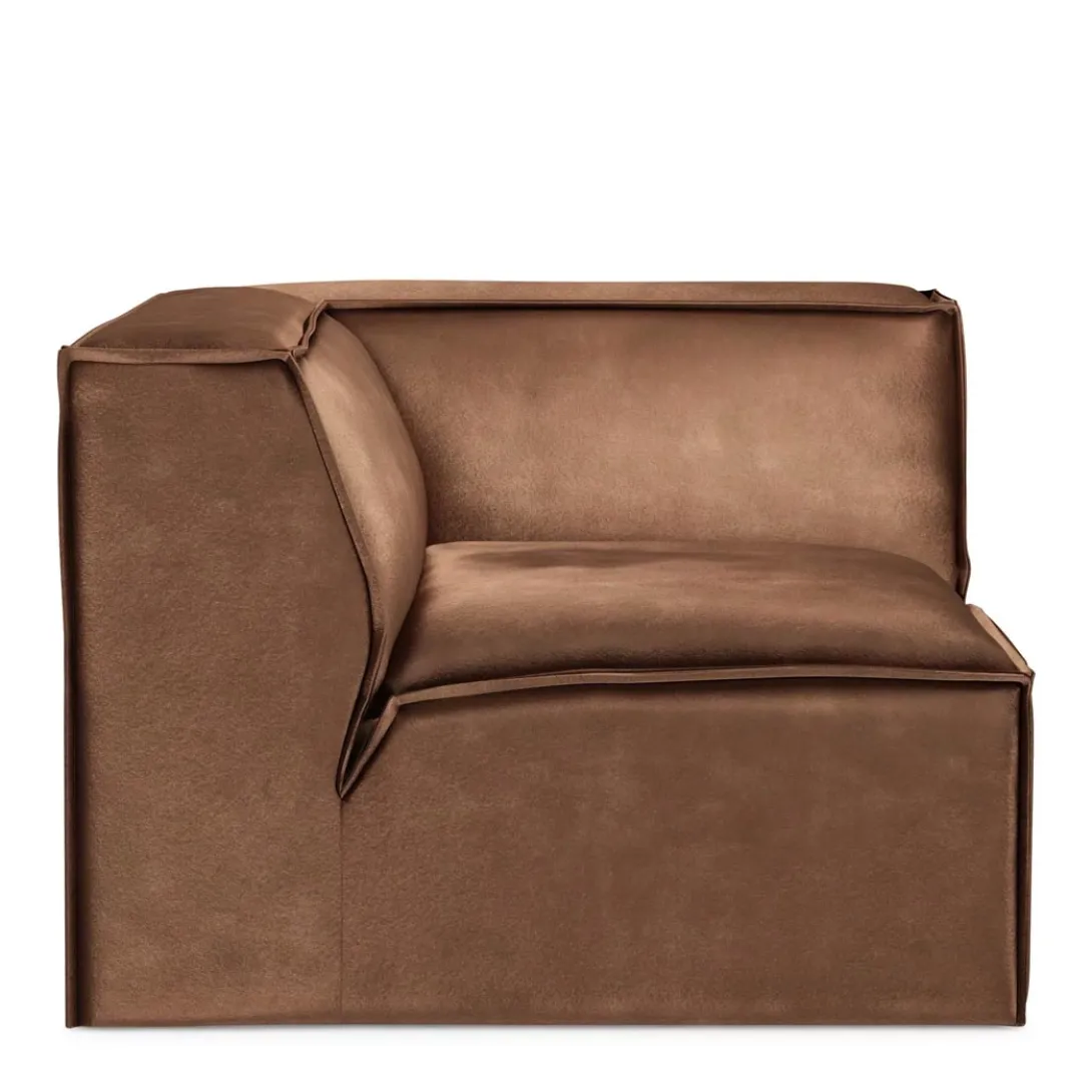 Een stoere bank in losse elementen, zodat naar believen een zitmeubel kan worden samengesteld. Dit hoekelement is 105 cm breed, er is ook een iets breder formaat verkrijgbaar. De bankelementen bestaan uit één stuk en zijn gemaakt van beukenhout. Daardoor zijn ze desgewenst goed te verschuiven. De velours bekleding is lekker zacht.