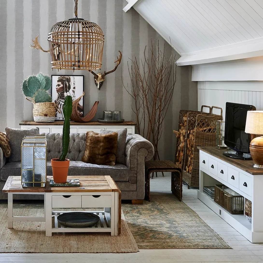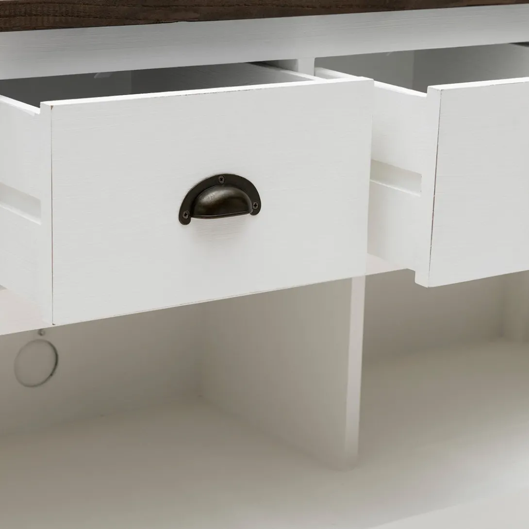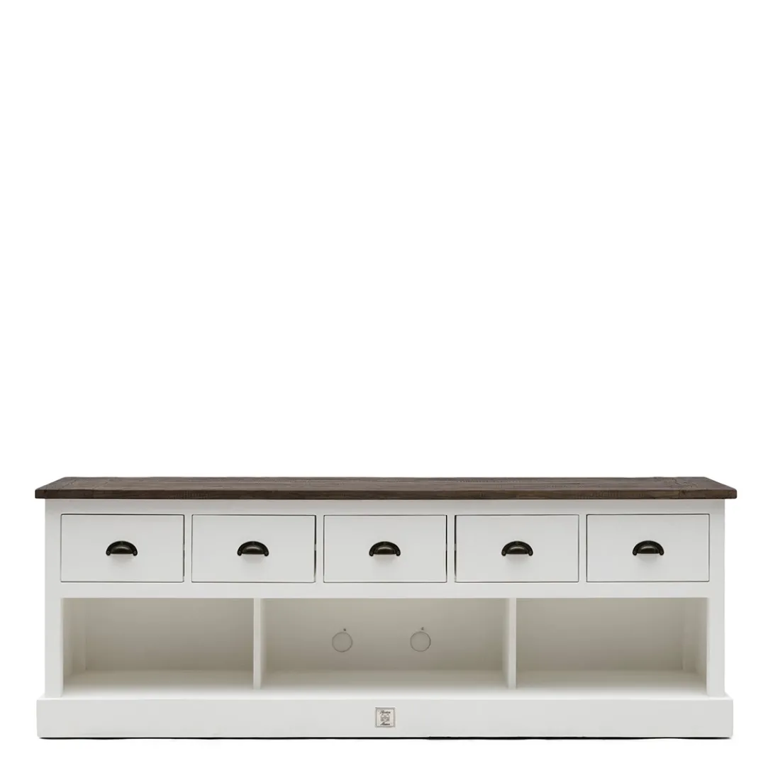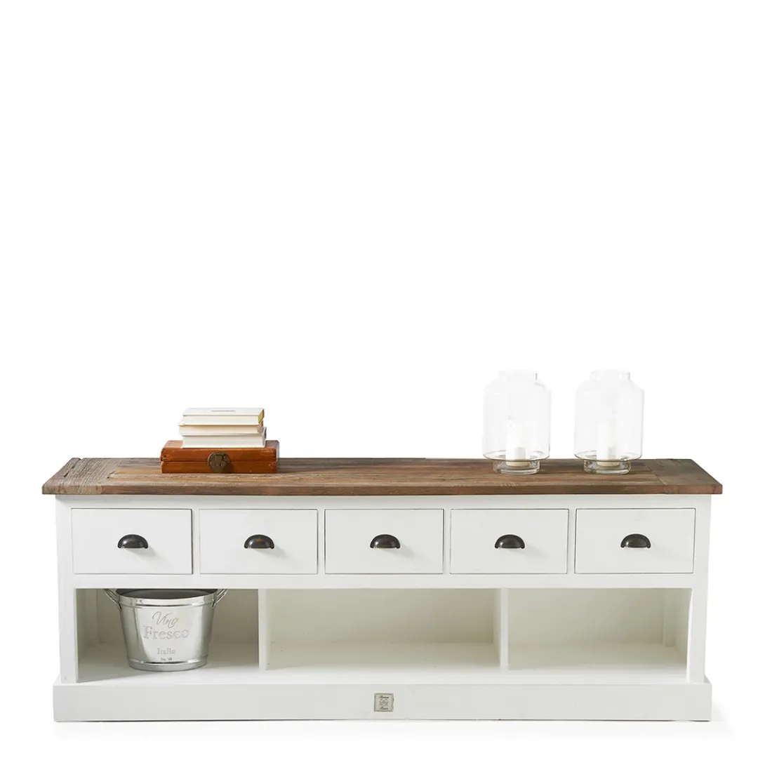 De Newport Flatscreen Dresser van wit populierenhout biedt veel bergruimte en heeft een vrij strak design. Het karakteristieke blad van oude schuurdeuren brengt het dressoir helemaal tot leven. Ook verkrijgbaar in 150cm.