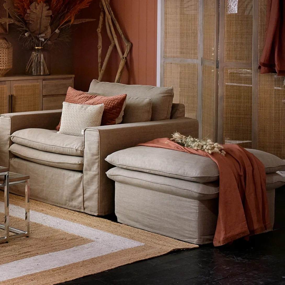 Deze Footstool heeft hetzelfde design als de Continental zitbanken en loveseats. Ook de Continental Footstool heeft één kussen met een plooi, waardoor het twee kussens lijken die netjes op elkaar liggen. Het kussen heeft uitstekende biezen. Omdat de stof washed is, kunnen er lichtere of donkere strepen in de stoffering zitten: dit is normaal. De Footstool is verkrijgbaar in twee verschillende maten.