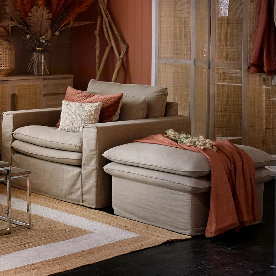 Deze Footstool heeft hetzelfde design als de Continental zitbanken en loveseats. Ook de Continental Footstool heeft één kussen met een plooi, waardoor het twee kussens lijken die netjes op elkaar liggen. Het kussen heeft uitstekende biezen. Omdat de stof washed is, kunnen er lichtere of donkere strepen in de stoffering zitten: dit is normaal.